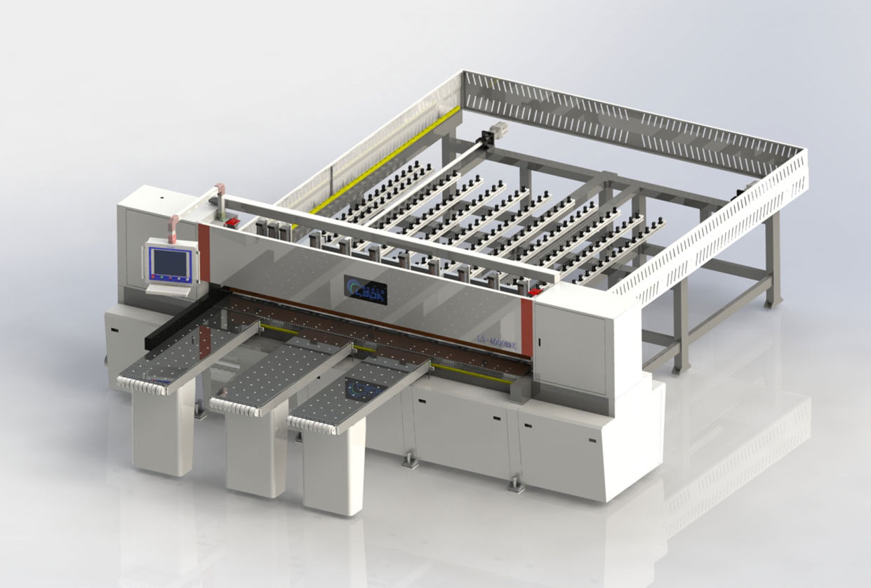 采用双气压,整体压料罩形式动作,气压由上往下压料,提高锯切安全性,有利于集中处理锯屑